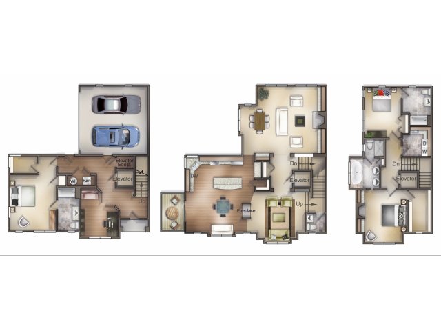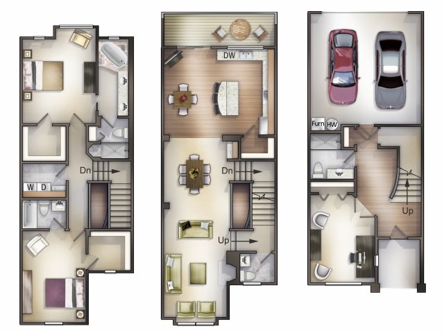 Three-story floor plans with private garage entries and individual ground-floor access—designed to feel like your own detached residence.