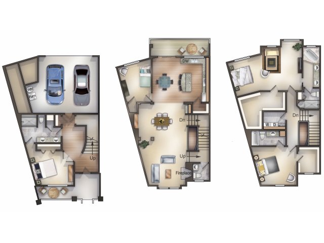 Vertical Architecture Multi-Level Townhomes Three-story floor plans with private garage entries and individual ground-floor access—designed to feel like your own detached residence.
